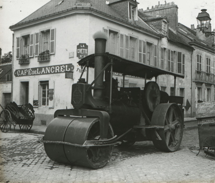 Alençon (Orne), Place de Lancrel, Bitumage de la rue avec une machine à vapeur équipée d’un rouleau compresseur, plaque de verre noir et blanc, (6 cm X 6.3 cm), [vers 1910], acquisition 2025, DR, AMA, 25Fi13.