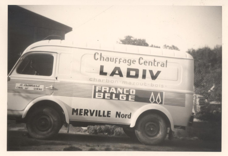 Ciral (Orne), camion « chauffage central, charbon – mazout – bois, Franco-Belge, Merville Nord, A.Aillard, Ciral, Orne », photographie noir et blanc, (9 cm x 13 cm), [Vers 1950 ?], DR, AMA, 17Fi8767.