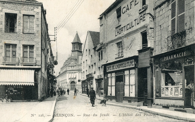 Alençon (Orne), Rue du Jeudi, L'Hôtel des Postes, carte postale ancienne noir et blanc n°128, édition Léon et Lévy (Paris), marque LL. et Neurdein réunis, Paris, (Date d'utilisation : sd), (14 cm x 9 cm), AMA, 4Fi3765.