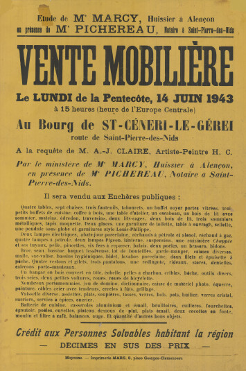 SAINT CENERI LE GEREI (Orne), Vente mobilière d’Auguste-Jean CLAIRE Artiste Peintre, route de Saint Pierre des Nids, M. MARCY Huissier et M. PICHEREAU Notaire, 14 juin 1943, affiche (42cm X 62cm), Imprimerie MARS, 8 place Clémenceau, Mayenne, AMA, 6FI7022.