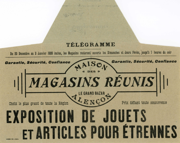 Maison des Magasins Réunis, le grand bazar Alençon, exposition de jouets et articles pour étrennes, communication : télégramme publicitaire, AMA, 62Z/3.