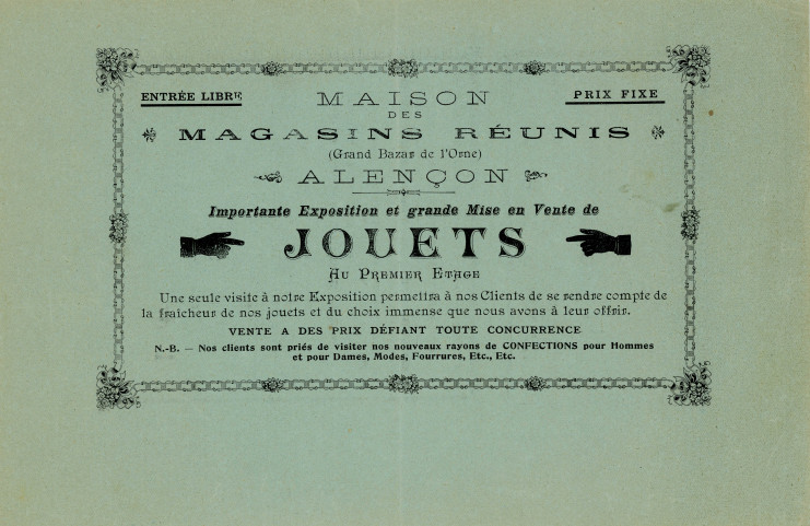 Maison des Magasins Réunis, le grand bazar Alençon, exposition de jouets et articles pour étrennes, communication : encart publicitaire, AMA, 62Z/3.