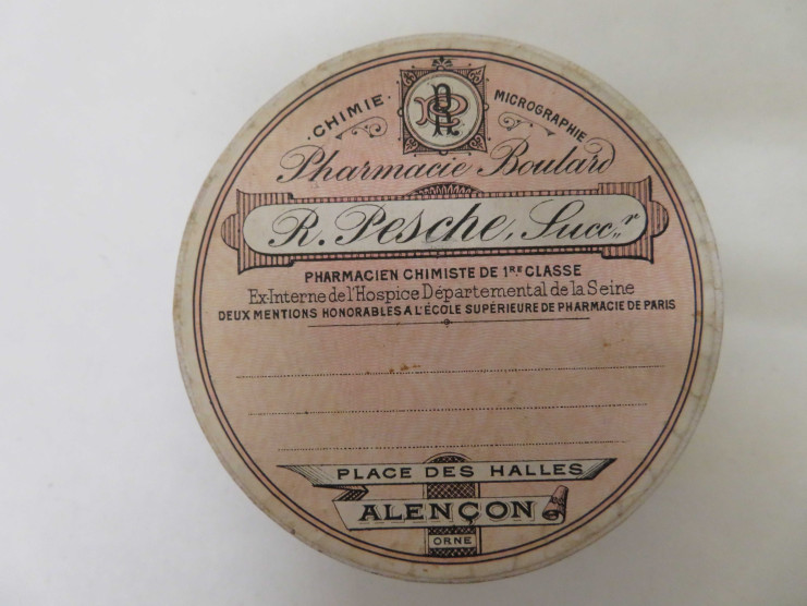Boîtes pharmaceutiques circulaires de Raoul Pesche (couleur : blanc noir rouge) avec étiquette blanche et rose (diam : 7cm, haut : 3.2cm) (1902-1940), AMA, OBJ/184.